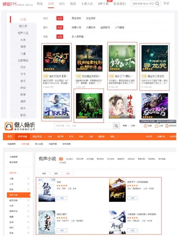 蜻蜓FM等有声平台,显然受制于作为最大版权方的阅文集团。锌刻度查询发现,蜻蜓FM、懒人听书等有声平台上,有声书栏目的爆款音频,其原始内容很多都来自起点中文网。