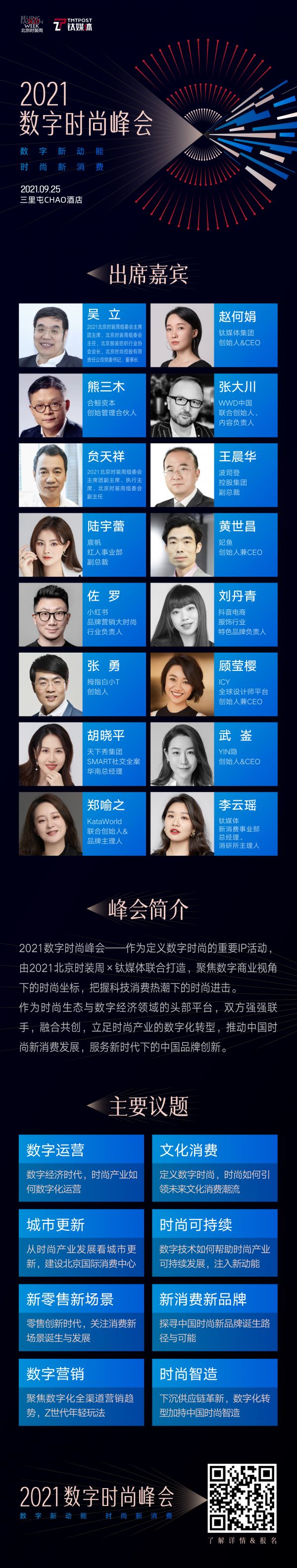 知名文化消费投资人熊三木、知名时尚媒体人张大川、国潮代表波司登、雪梨女装、数字化可持续时尚代表妃鱼、生态平台代表小红书、抖音电商、新消费品牌白小T、ICY 、YIN、KataWorld以及数字营销专家天下秀集团,将围绕“数字新动能 时尚新消费”主题悉数登场。