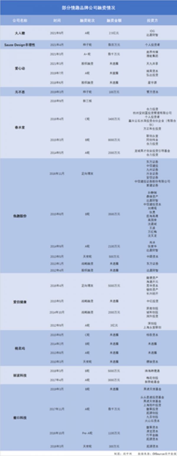 这并非该赛道在今年的首次融资。今年3月,成人用品新零售品牌“爱心动”连续完成了来自天九共享的股权融资以及由商界传媒集团、潜能资本联合投资的千万级A+轮融资;4月,情趣潮玩品牌SauceDesign非理性则完成了数百万人民币种子轮融资。