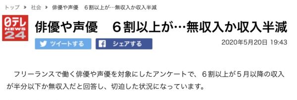 但随着近年来声优群体的扩大以及动画制作行业的成本降低,声优的酬劳在一定程度上呈减少趋势。再加上疫情影响,接不到工作的声优们只能持续每月“无收入”的惨状。据2020年5月12日“日俳連”的问卷报告显示,在接受问卷调查的293名演员和声优中,有22.9%的人表示本月无收入,有43.3%的人表示收入不足之前的一半。
