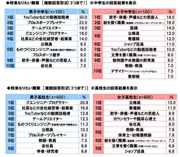 直到现在,声优在日本,尤其是日本青少年群体中依然是一个炙手可热的理想职业。2019年,索尼生命保险针对“日本初高中生将来最想从事的职业”的调查中,想要成为歌手、演员、声优等明星的女初中生占比18%,位列第一,选择了相同选项的女高中生占比也达到了8.8%,位列第三。男初中生中想要从事该行业的占比也达到了8.0%,位列第九。这组数据在一定程度上反映出日本声优所具有的社会影响力,同时也展现了这一行业竞争的激烈程度。