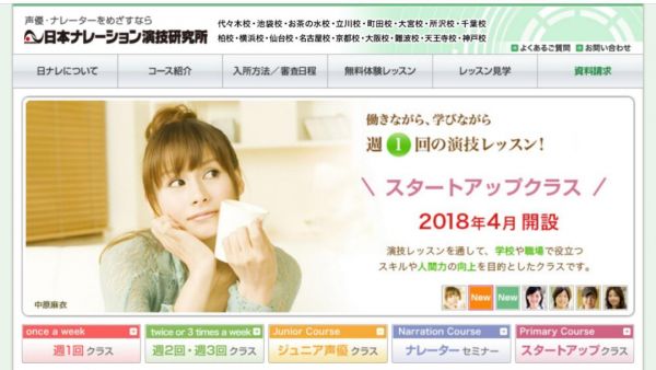 日本播音演技研究所有代代木、池袋、千叶、横滨、仙台、京都、大阪、名古屋等17个分校,授课类别也十分丰富,分为一周一次课程、一周两次课程、一周三次课程、旁白员课程、初始课程(スタートアップクラス)和新人声优课程(ジュニアクラス),时间设置较为灵活。除新人声优课程外,单次课程时间都为两个半小时,新人声优课程时间为两小时。具体学费及课程内容如下表。