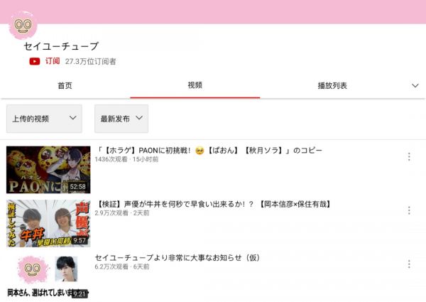 YouTube上也有“声优tube Channel”(セイユウチューブチャンネル)之类的频道。这类频道没有固定的出演者,但每期都会邀请知名声优出演,冈本信彦、村濑步、保住有哉等都在这个频道上进行过游戏直播。还有声优事务所开通YouTube频道鼓励旗下艺人投稿,如声优事务所“響”所开通的“HiBiKi StYle”等。特别是在疫情期间,开通Youtube频道的声优数量明显增长。