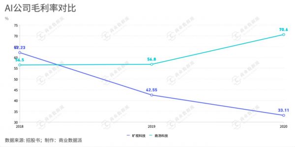 但是另一方面,商业模式方面的问题也渐渐凸显。首先,从财务数据层面看,行业内毛利率差距较大,例如2020年,商汤科技毛利率为70.6%,旷视科技为33.11%。