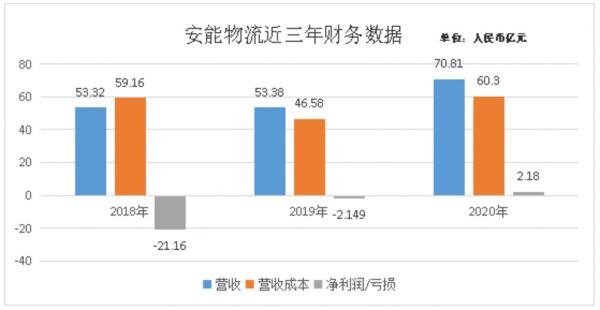 2020年,安能物流彻底剥离了快递业务,同期其成功扭亏为盈,净利润达到2.18亿元;此外,其营收数据也创下新高,达70.81亿元,营业成本则较好地控制在了60.3亿元。