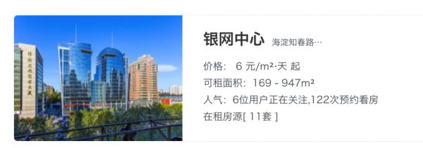 作者在租赁网站查询发现,银网中心从租金最高时的12元/天/平米低至如今6元/天/平米。「小业主名下的物业租金在8元/天/平米左右,价格还能谈,押金方面最低能到押二付三。但到6元/天/平米不太可能,可能是除去物业费和发票后的价格。」银网中心的租赁销售称最近的行情比之前的高点回落了不少。
