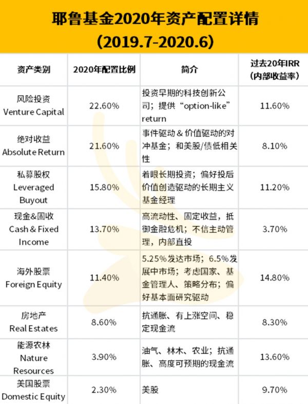 “耶鲁模式”的关键点是坚持长期资产配置,鹿博士根据其财报,梳理出了耶鲁的资产类别,具体的资产解释和对应收益见下表: