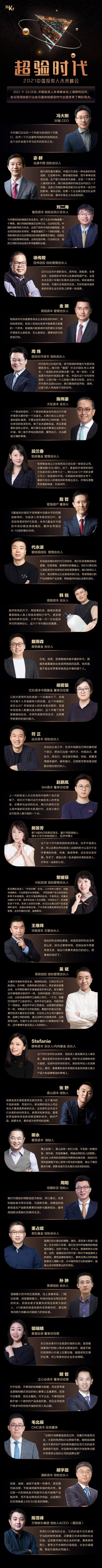 2021中国投资人未来峰会邀请了DCM中国、经纬创投、光速中国、凯辉基金、创世伙伴资本、BAI资本、华映资本、华创资本、明势资本、峰瑞资本、歌斐资产、愉悦资本、钟鼎资本、光点资本等投资机构、中介机构的掌门人和主要负责人,希望从不同角度和维度为整个行业带来一些全新的思考方向。