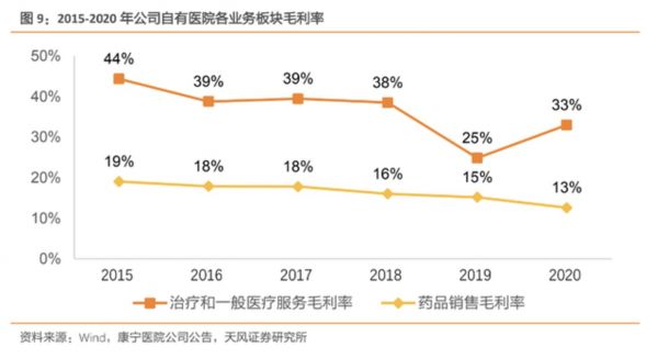 此外,近五年来其两大主营业务的毛利率也呈现“跌跌不休”的趋势。招股书显示,2015年到2020年,其治疗和一般医疗服务的毛利率从44%降低至33%,药品销售的毛利率从19%一路降至13%。