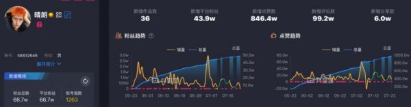 第三方抖音数据监测平台显示,抖音账号「晴朗」在5月23日到7月23日的两个月内,涨粉数量达到了43.9万,这几乎占了其总粉丝量的将近7成。