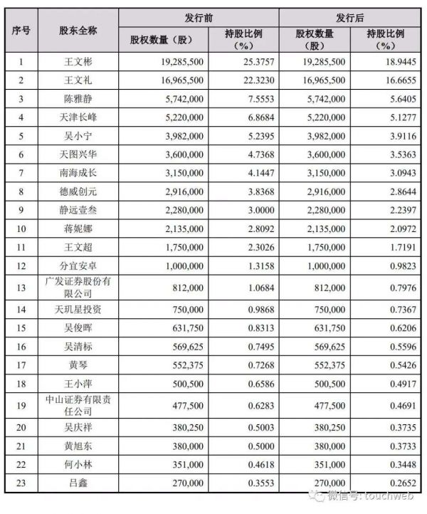 IPO后,王文彬直接持股为18.9445%,王文礼持股为16.6655%,陈雅静持股为5.6405%,天津长峰持股为5.1277%;吴小宁持股为3.9116%,天图兴华持股为3.5363%,南海成长持股为3.0943%。