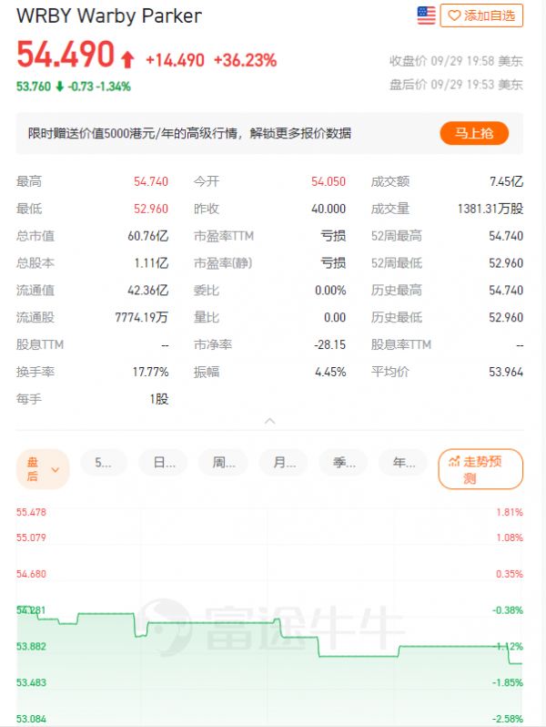 北京时间9月29日,美国DTC眼镜巨头Warby Parker正式登录纽交所,股票代码“WRBY”。截至9月29日美股收盘,Warby Parker首日股价涨36.23%,报54.49美元,市值约为60.76亿美元。