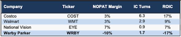 但在盈利方面,Warby Parker 的税后净营业利润(NOPAT )从 2019 年的 300 万美元下降到 2020 年的 -4000 万美元。NOPAT 利润率从 2019 年的 1% 下降到 2020 年的 -10%,其利润能力处于下降趋势。
