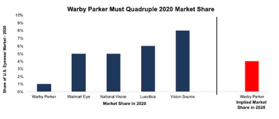 据New Constructs, LLC 数据,Warby Parker 仅占美国眼镜市场 1% 的份额,远低于 Vision Source、Luxottica、National Vision、Walmart Vision、Costco Vision等大型竞争对手的市场份额。