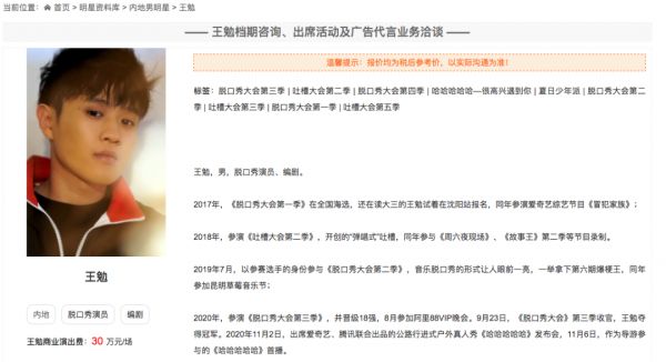某经纪业务代理网站显示,目前王勉商业演出费用参考价在30万元/场。