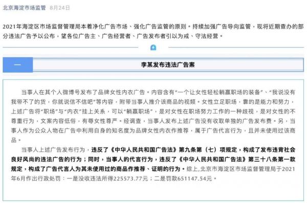 今年6月,北京市海淀区市场监督管理局对李诞代言Ubras广告进行行政处罚,没收了李诞的“违法所得225573.77元”。而李诞仅仅是在其微博上发布了推广Ubras的图文+视频。