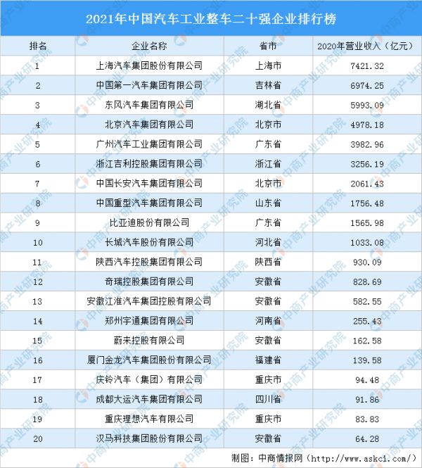 2021中国汽车工业整车20强