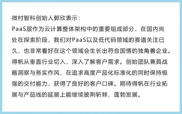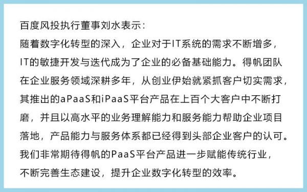 “得帆云PaaS平台极大地提升了企业管理软件数字化的效率,通过得帆自主PaaS产品帮助客户实现企业软件生产力的全面升级,与得帆信息合作过的诸多行业头部客户都有很深的体会。得帆信息从2014年成立以来就坚持自主创新,自主研发,重视开源体系,打造让客户满意的产品,始终“以客户为中心”构建产品体系和服务体系,所以会持续赢得客户的尊重和高满意度,通过本次融资,得帆将持续在自主研发和生态建设加大投入,持续保持得帆在制造业PaaS平台的领先优势,助力中国智造的数字化转型,同时,得帆信息继续保持务实的心态和初衷,以客户为中心,全力以赴助力客户实现数字化战略目标。”