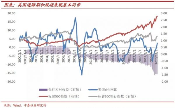 首先,我们需要了解价格上行时,银行指数表现:通胀上行带来正绝对收益,相对收益则取决于经济修复。