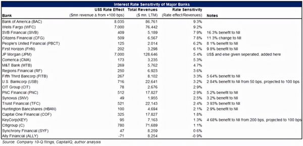 在利率敏感性方面,并非所有银行都是一样的。与拥有计息储蓄账户的银行相比,活期存款等免息存款集中度更高的银行从更高的利率中获益更多,因为它们在利率上升时不必支付更多费用。