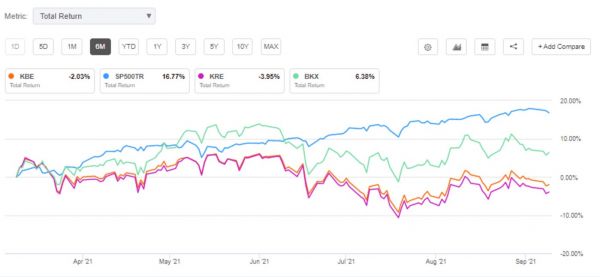 在过去的六个月中,SPDR标准普尔银行ETF(NYSEARCA:KBE)、SPDR标准普尔区域银行ETF(NYSEARCA:KRE)和纳斯达克KBW银行指数都落后于标准普尔500指数。
