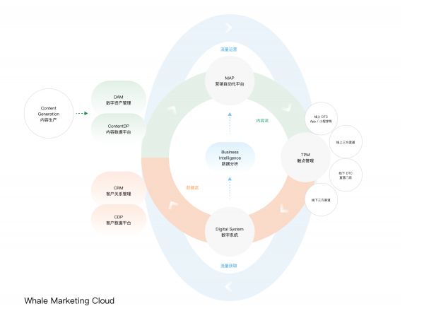 当前消费品牌面临日益复杂的营销运营环境,帷幄营销云提供的大规模数字化技术杠杆,可以有效提高品牌的流量获取和运营效率。帷幄营销云主要聚焦于消费品牌的智能化营销及销售环节,通过采集、分析企业线上线下营销运营数据,以促进营销自动化,实现精准营销、降本增效。Whale Marketing Cloud主要包括营销自动化(Marketing Automation Platform)、门店数字化(In-store Digitalization)、数字资产管理(Digital Asset Management)、客户数据(Customer Data Platform)、商业智能(Business Intelligence)和统一数据系统(One Digital System)六大产品,打造大规模实时数字化营销闭环。同时,基于云原生和低代码的帷幄开放平台(Whale Open Platform),为客户提供简单易用、可移植、可伸缩、可模块化部署的AIoT和数据应用服务。