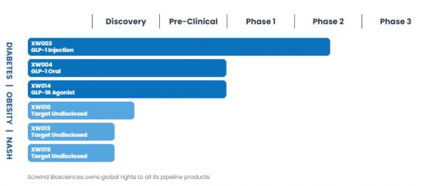 「先为达生物」进展最快的胰高血糖素样肽-1(GLP-1)类似物管线XW003是一种可注射的GLP-1类似物。XW003利用GLP-1会在摄入食物时自然释放,然后迅速降解,且可以作用于消化道、肝脏、胰腺和中枢神经系统的特点,将其作为治疗2型糖尿病、肥胖症的有效工具。该药物在1期临床研究中已显示为安全且耐受性良好,正在进行2期临床研究,具有治疗NASH的临床潜力。