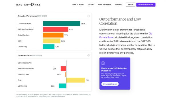 在传统资产市场规模异常庞大的背景下,越来越多投资者开始寻求多元化持股策略,而相应的,越来越多的主打另类投资的技术平台正在涌现。「Masterworks」正是这样一家主打名家画作、雕塑等艺术作品的‘分拆股份’投资的初创公司。该公司致力于通过全新的理念,让散户投资者也有机会将艺术作品这类高估值、低流动性、信息透明度有限但有较强保值增值潜力的资产也纳入其投资组合中。