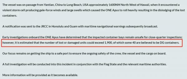 损失或受损的集装箱数目可能超过1900个,其中约有40个是危险品集装箱
