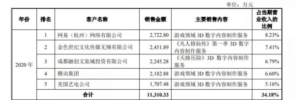 在3D数字内容制作业务中,游戏的3D制作是原力动画更主要的营收来源。网易、腾讯、美国艺电均是其固定的客户。去年原力动画负责网易《阴阳师》游戏中的3D内容制作,就带来了2722万元收入,占比8.23%,与腾讯合作的《王者荣耀》为其带来了2182万元的收入,占比6.6%。