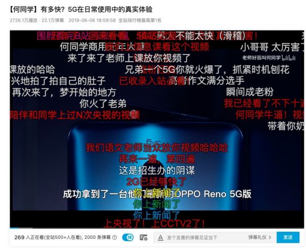 确实,让何同学在B站科技区迅速积累人气并且蹿升为头部UP主的视频是2019年6月他发布的《有多快?5G在日常使用中的真实体验》。该视频一夜间播放量超过500万(目前B站累计播放量超过2700万),并被人民日报、共青团中央等数家官方媒体关注并报道,何同学迅速出圈,成为B站代表性的UP主之一。