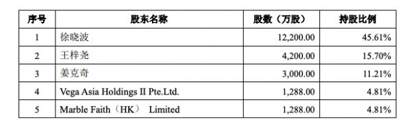 截至辅导备案申请日,认养一头牛五大股东分别为徐晓波、王梓尧、姜克奇、KKR、德弘资本,其中创始人徐晓波直接持有公司股份比例45.61%,通过员工持股平台宁波飞牛、宁波犊牛分别间接持股 0.28%、0.04%, 最终受益持股比例为 45.93%。