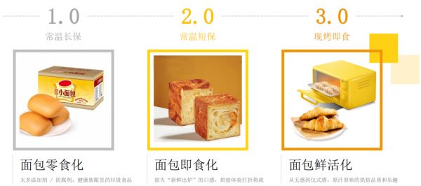 3.0时代则是以现烤即食的预烘焙产品为主的“面包鲜活化”,满足了消费者对于美味与便捷的需求。