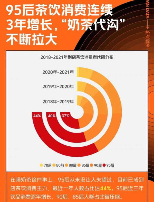 《2021年茶饮消费洞察》显示,5年前新茶饮刚兴起时以90后为主, 如今95后成为到店茶饮消费的主力,最近一年占整个消费市场的比例高达44%,90后、85后人群的占比被反向压缩。