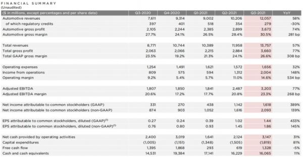 特斯拉2021Q3盈利情况,截图自财报