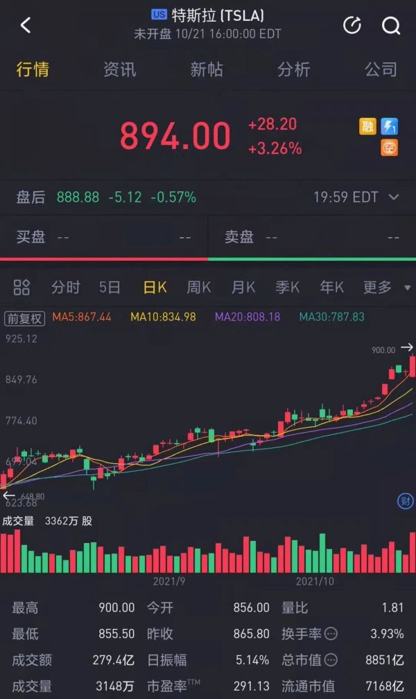 截至发稿前,特斯拉股价已达到了894美元/股,相比于发布Q3财报的当日,股价增幅达到了3.26%。市值方面,也达到了8851亿美元,不仅逐步靠近9000亿美元大关,同时继续稳坐着全球市值第一车企的位置。