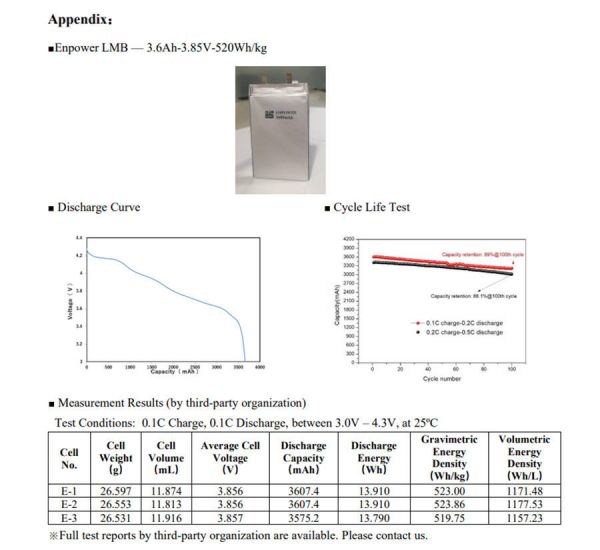 最前线 | 恩力动力成功研制出520 Wh/kg(1100 Wh/L)超高比能锂金属电池