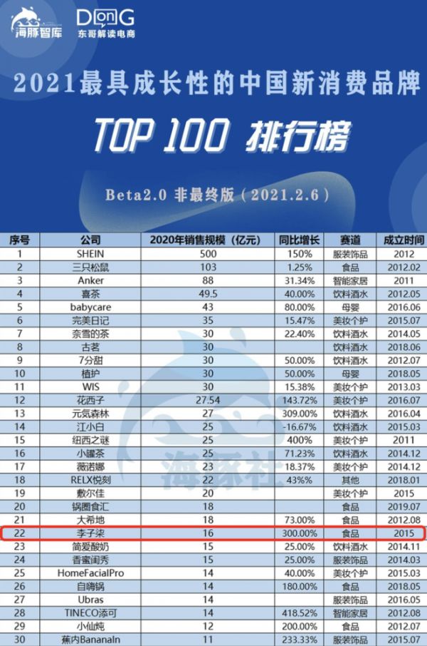 海豚智库显示,李子柒品牌2020年销售额为16亿,同比增长300%,在中国新消费品牌中排名22,且广告营销费用显然低于其他品牌。