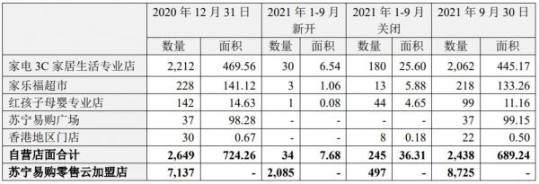 此外,苏宁易购持续推进降本、提效、增收工作。例如业务和组织的调整和优化,加快亏损门店的调整及门店降租转租招商等工作。2021年前三季度,苏宁易购关闭各类自营门店245家,新开34家,截至9月30日共有自营门店2438家,2020年底为2649家。
