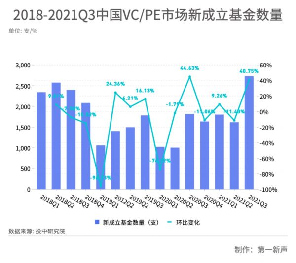 投中研究院统计,2021年三季度,中国VC/PE市场新设基金2730支,与19年起的近几期及基金数量相比,接近于翻倍上涨,更是突破了18年二季度2574支的历史记录。细分数据下,7月、8月、9月分别新设基金987支、867支、876支;均高于往期月度新设数量。