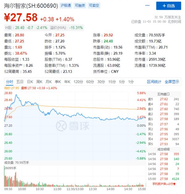 财报发出后,也得到了资本市场的回应。11月1日,港股开盘,海尔智家股价一度涨幅超过5.55%。