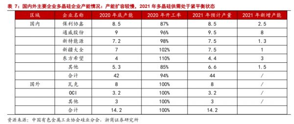 现阶段,硅料行业的产能增加主要依赖于头部企业扩产,由于多晶硅产线的建设周期长达18个月,因此硅料产量爬坡极慢。据中国有色金属工业协会的分析,2021年中国硅料预期产量将在44万吨,全球产量约58.2万吨。
