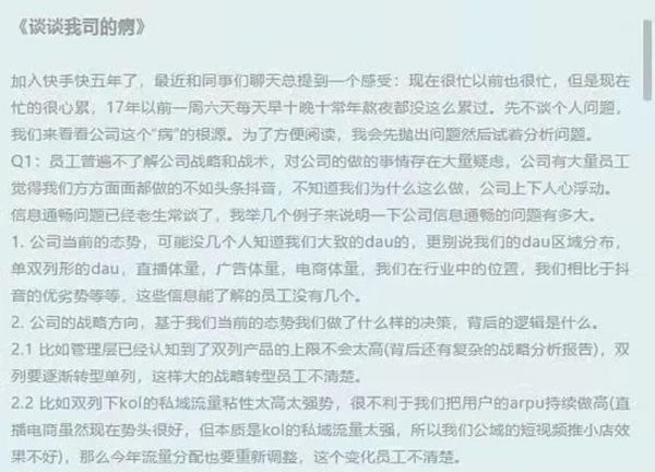 2020年,一位名叫朱蓝天的快手前50号员工在公司内网上发布了一条帖子,名叫《谈谈我司的病》,直接指出快手的几大“顽疾”——消失的老板、空降管理者、派系林立、信息不通畅等等。