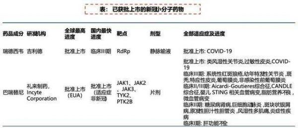 在此之前,在小分子药物领域,已有两款药获批上市或获批紧急使用,用于治疗新冠肺炎,分别为吉利德的瑞德西韦(注射液)、礼来制药的巴瑞替尼(片剂)。