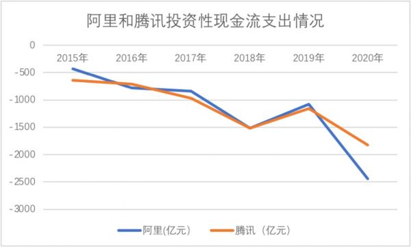 前者是相对比较容易理解的,任何一个行业的头部企业都可根据其“先发优势”获得定价权并随之带来极为丰厚的利润回报。企业手握现金,这又给其通过扩张抬高市盈率创造了条件,我们整理了近几年内阿里和腾讯两家互联网巨头在投资性现金流方面的支出情况,见下图