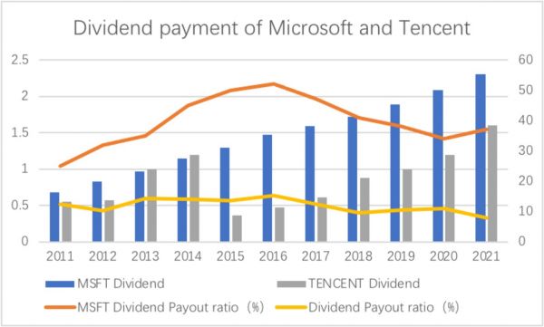 我们将腾讯与微软的股息支付率进行了对比(美股股息/EPS),见下图