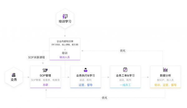 2021年,「酷学院」基于业务延伸探索,推出了“业培一体”产品和解决方案。核心逻辑是把培训课程对应到SOP的项目中,企业在SOP执行中可先学再做,或者在执行中可以边学边做,也可以在执行出问题后以工单形式触发学习任务,员工修正工作标准的前提是先学习再执行,以此循环、闭环即可做到真正的事件驱动、业务驱动。「酷学院」“业培一体”的产品能力目前已在连锁行业100多家企业得到落地,与物业、制造、房地产等其他行业企业的共创正在逐步推进中。