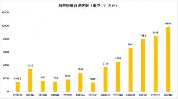 财报显示,蔚来第三季度总营收为人民币98.053亿元,与去年同期相比增长116.6%,与上一季度相比增长16.1%,超过分析师预期的93亿元。