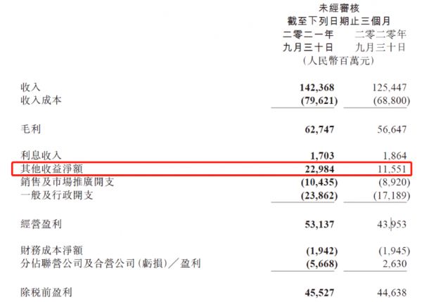 实际上,Q3的利润里还有一部分非腾讯核心业务的“其他收益”,主要是来自“处置及视同处置投资公司的收益净额”。这部分在本财季有229.8亿元,去年同期只有115.5亿元。有人可能对此有异议,认为非腾讯自己本身业务获得的收入并不能直接算作收入。