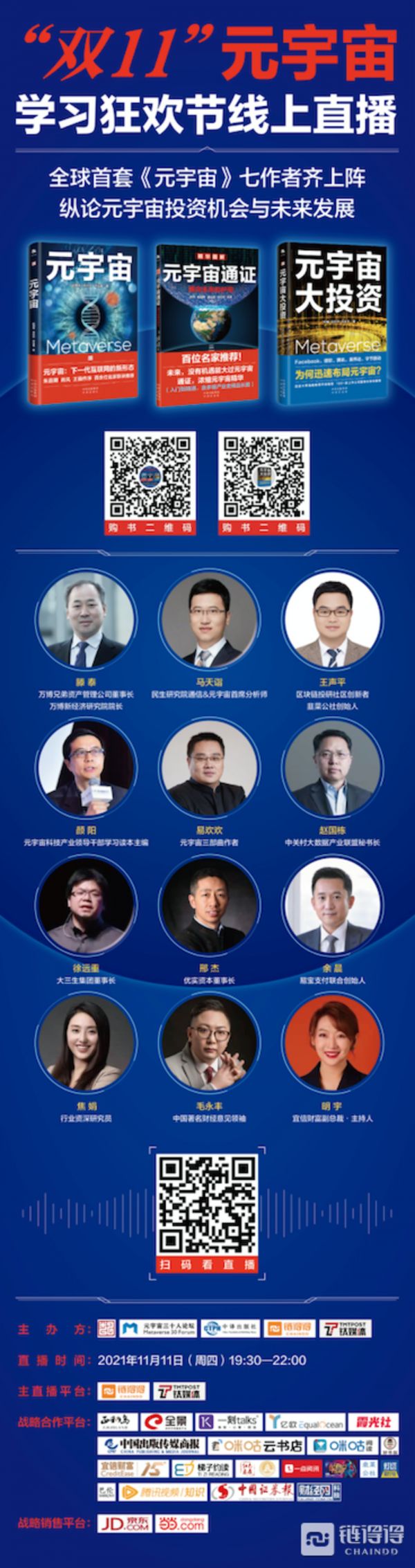 由中关村大数据产业联盟、元宇宙三十人论坛(筹)、中国出版集团中译出版社、链得得和钛媒体主办的元宇宙“双11”学习狂欢节于11月6日晚19:30正式开启。